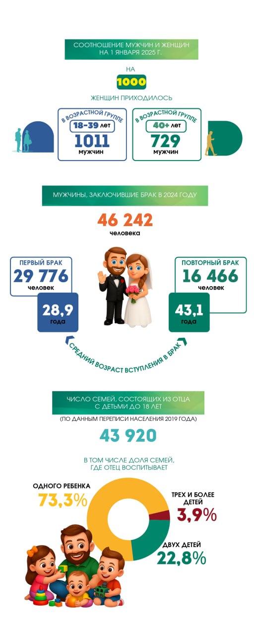 Число семей, состоящих из отца с детьми до 18 лет по данным переписи населения 2019 г. - 43 920, в том числе доля семей, где отец воспитывает одного ребенка – 73,3%, двух детей – 22,8%, трех и более детей – 3,9%.